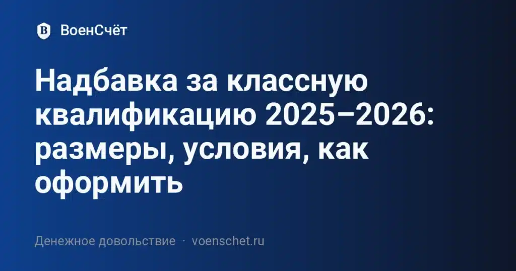 Надбавка за классную квалификацию в 2025–2026 годах — это ежемесячная доплата к окладу по воинской должности (ОВД) за присвоенный класс: 3-й, 2-й, 1-й или «мастер». Проценты фиксированные, сумма в рублях зависит от ОВД. Основание — п. 15 ст. 2 ФЗ № 306-ФЗ. КонсультантПлюс
