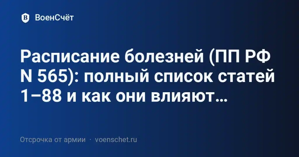 Расписание болезней 1–88 — это навигатор по ПП №565 с официальными названиями статей, быстрым поиском и ссылками на первоисточник. Ниже вы найдёте полный список статей и краткие пояснения, как они связаны с категориями годности A/Б/В/Г/Д по графам I/II/III.