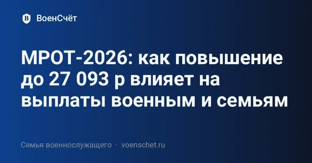 С 1 января 2026 года федеральный МРОТ планируют повысить до 27 093 ₽ (законопроект № 1026183-8 внесён в Госдуму 29.09.2025; рост на 20,7% от МРОТ-2025 = 22 440 ₽). МРОТ используется при расчёте зарплат на «минималке», минимальных больничных и декретных, а также в «правиле 4 МРОТ» для назначения Единого пособия на детей. Денежное довольствие военнослужащих определяется не МРОТ, а отдельным законом и постановлениями Правительства. КонсультантПлюс