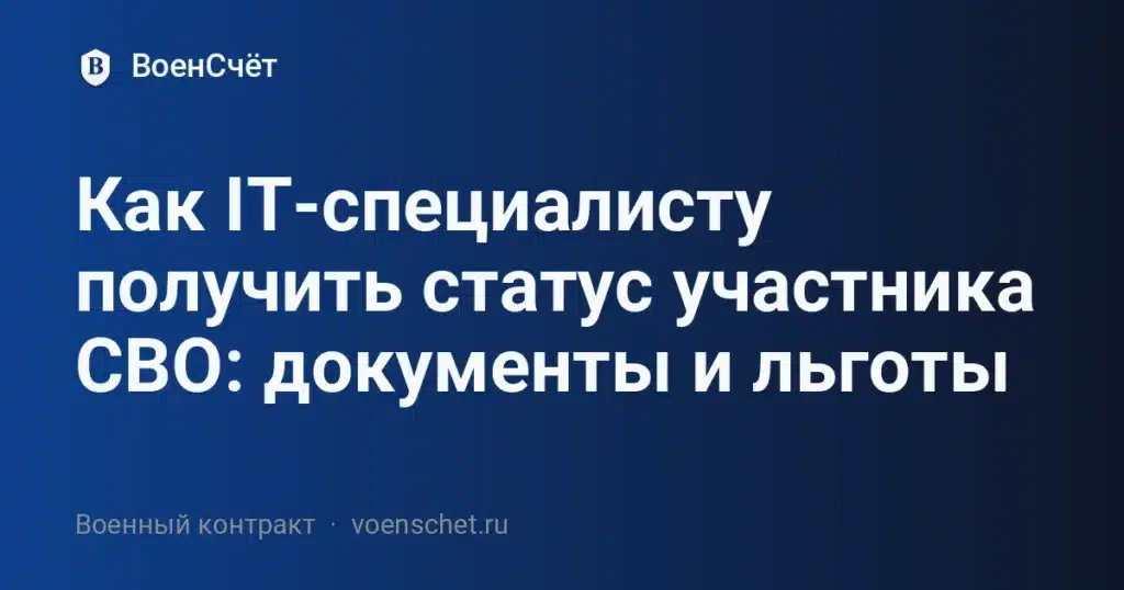 IT-специалист получает статус участника СВО не «по профессии», а по факту привлечения к задачам СВО соответствующим ведомством/воинской частью. Основание подтверждается справкой об участии в СВО установленной формы (ПП РФ № 1354) — её выдают через Минобороны (ФКУ «Военно-социальный центр»), военкоматы/части и МФЦ; подача доступна и через «Госуслуги». Справка — базовый документ для большинства мер поддержки. Государственный университет СПб