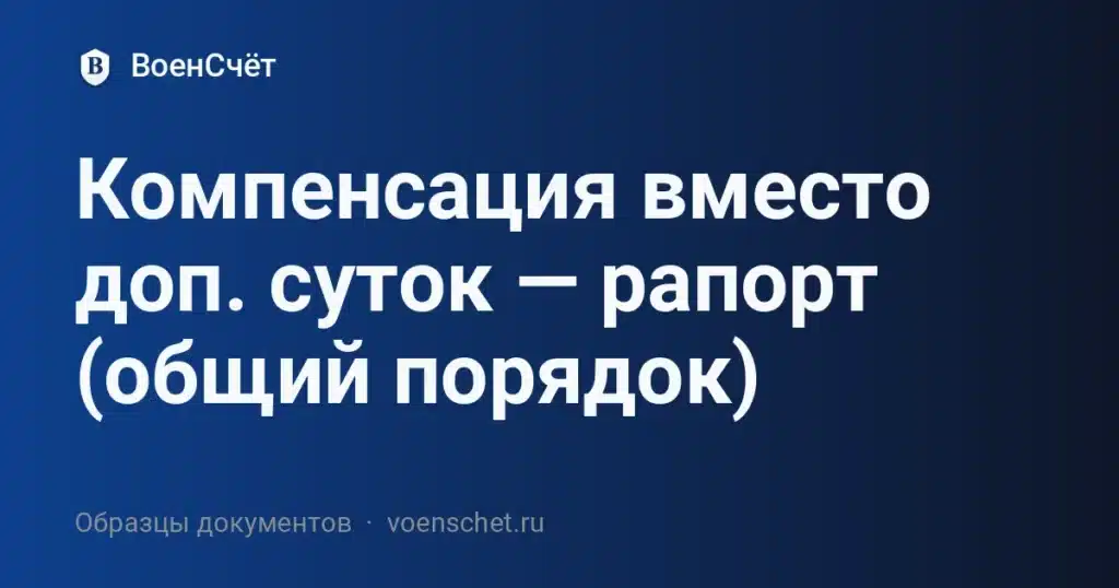 Компенсация вместо доп. суток — это денежная выплата, которую военнослужащий вправе запросить взамен предоставления дополнительных суток отдыха за привлечение к службе сверх установленной продолжительности, а также за работу в выходные и нерабочие праздничные дни. На практике компенсация вместо доп. суток помогает закрыть занятость по нарядам, боевому дежурству, участию в учениях, командировкам и иным задачам, когда отгулы объективно не удаётся использовать в разумный срок. Чтобы инициировать выплату, подают рапорт на имя командира через канцелярию, прикладывая расчёт доп. суток и подтверждающие документы (приказы, наряды, журналы, табели, командировочные удостоверения, путевые листы и т. д.).