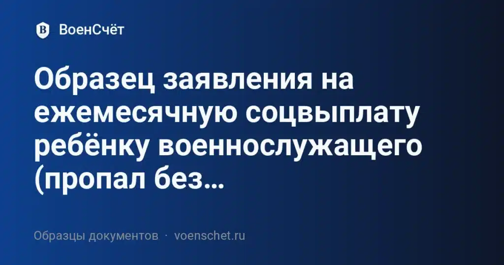 «Прошу назначить ежемесячную социальную выплату ребёнку __________________ (Ф.И.О., дата рождения) в связи со статусом военнослужащего — __________________ (пропал без вести/захвачен в плен), подтверждённым документом № ___ от ..____. Перечислять средства на счёт _____________ (реквизиты прилагаются).»