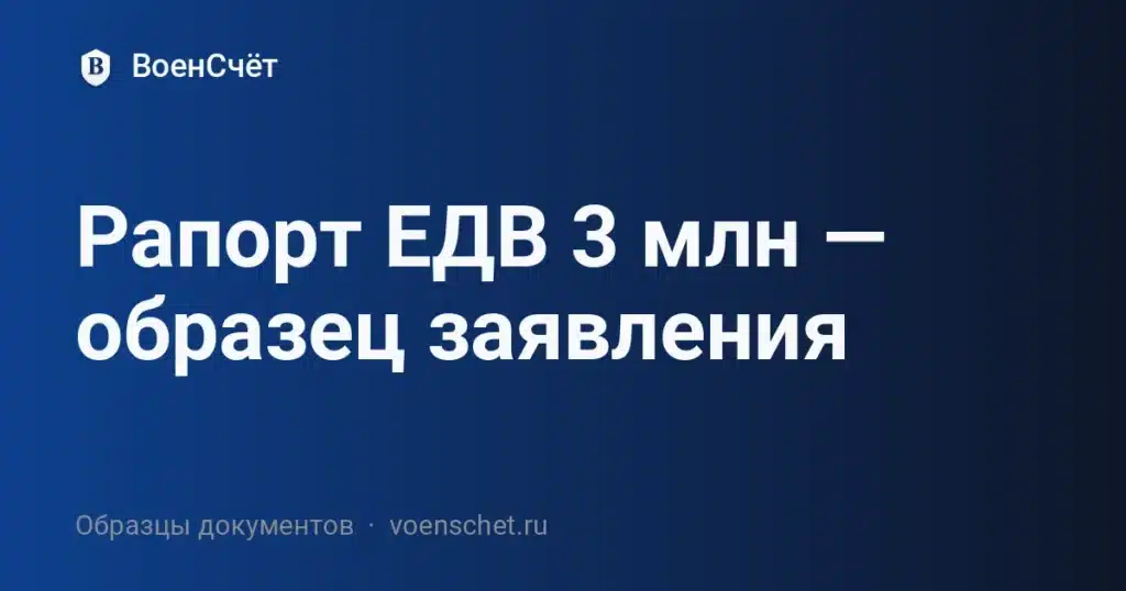 Рапорт ЕДВ 3 млн подают военнослужащие, получившие ранения, травмы или контузии при исполнении обязанностей, чтобы запустить процедуру назначения единовременной денежной выплаты. Грамотно оформленный рапорт ЕДВ 3 млн фиксирует обстоятельства события (дата, место, Украина/Сирия), вид повреждения, наличие акта НС/служебной травмы и медицинских документов, а также итоговое заключение ВВК о причинной связи и категории годности. Чем точнее вы изложите факты и перечислите приложения, тем быстрее финансово-экономическая служба (ЕДЦ) и уполномоченный орган проверят право, рассчитают сумму и направят деньги на ваш счёт. На этой странице — бесплатный образец DOCX, пошаговые подсказки, чек-лист и ответы на частые вопросы. Формулировки универсальны: вы можете использовать документ как при ранении в Украине, так и при ранении в Сирии, при этом объём и порядок ЕДВ применяются по актуальным нормативным актам на дату решения (в примере указан размер 3 000 000 руб. — при наличии права).