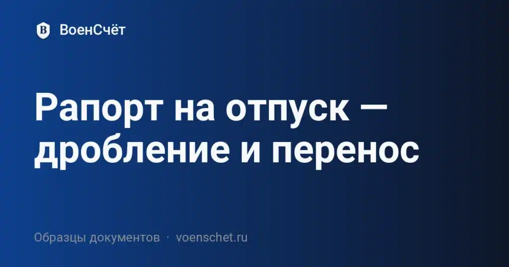 Рапорт на отпуск оформляют, когда нужно официально согласовать предоставление части основного отпуска, его дробление на несколько периодов или перенос дат. Грамотно составленный рапорт на отпуск помогает избежать срывов графика, двойных нарядов и возвратов из-за формальных недочётов. В этом материале вы найдёте бесплатный образец DOCX, а также пошаговые рекомендации: как корректно указать даты, длительность, основание дробления или переноса, кто будет исполнять обязанности на время отсутствия и какие документы приложить. Рапорт лучше подавать заранее, чтобы отдел кадров успел сверить график отпусков, а командир — распределить нагрузку в подразделении.
