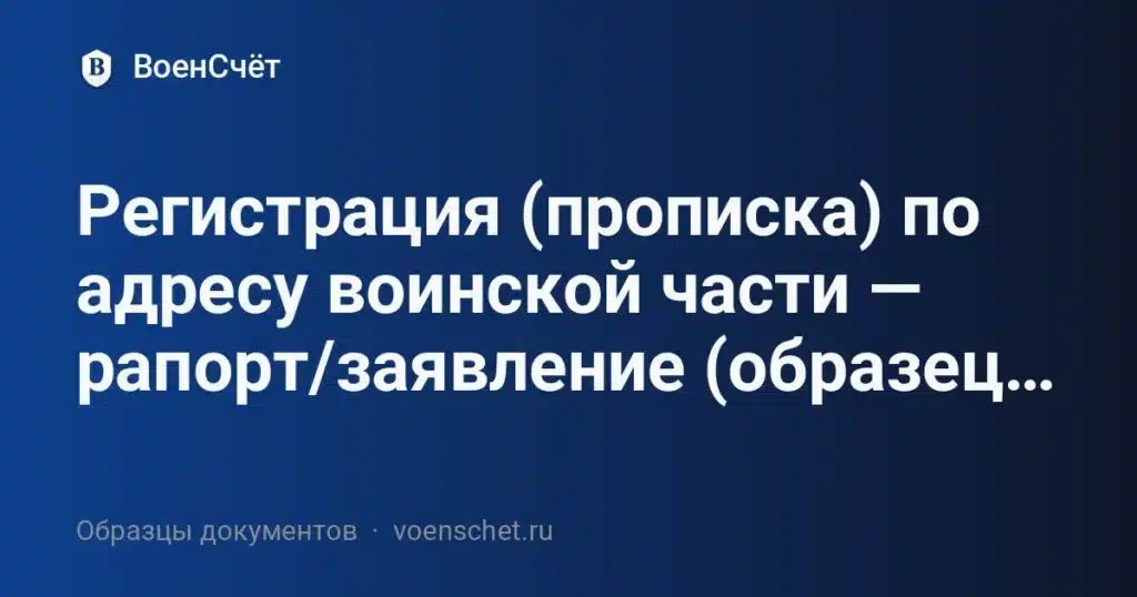 Регистрация по адресу воинской части нужна, когда военнослужащий фактически проживает в казарме, общежитии или служебном жилом блоке части и ему требуется оформить постоянную или временную регистрацию для медицины, школы/садика, банков, соцвыплат и делопроизводства. В большинстве случаев подаётся рапорт/заявление на имя командира с просьбой согласовать регистрацию и направить пакет в жилищную службу и уполномоченный орган по вопросам миграции. В бланке удобно сразу выбрать вид регистрации: постоянная (по месту жительства) или временная (по месту пребывания) с указанием срока.