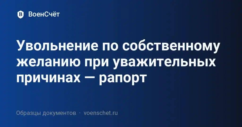 Увольнение по собственному желанию при уважительных причинах оформляется рапортом на имя командира с приложением подтверждающих документов. Такая процедура применяется, когда служба объективно несовместима с жизненной ситуацией: уход за тяжело больным родственником, медицинские ограничения по состоянию здоровья (заключение ВВК/ЛПУ), переезд супруга(и) к новому месту службы или работы, рождение и уход за ребёнком, невозможность совмещения со очной формой обучения, острые жилищные обстоятельства и другие подтверждённые основания. Корректно составленный рапорт ускоряет согласование, помогает кадровой и финансовой службам подготовить приказы и расчёты, а вам — получить решение без «возвратов».