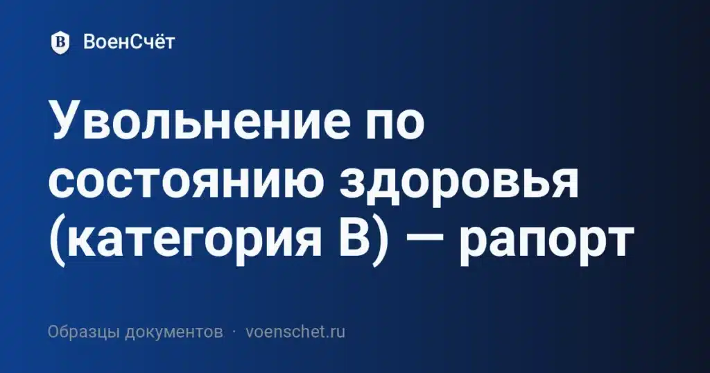 Увольнение по состоянию здоровья категория В применяется, когда по заключению военно-врачебной комиссии военнослужащему установлена категория годности «В» — «ограниченно годен к военной службе». В таком случае решение об увольнении оформляется через рапорт на имя командира. Грамотно составленный документ ускоряет подготовку проекта приказа, исключение из списков личного состава, предоставление отпуска перед увольнением или выплату компенсации за неиспользованные дни, а также конечный расчёт и выдачу справок. Во введении рапорта важно прямо сформулировать просьбу об увольнении по состоянию здоровья категория В, сослаться на номер и дату заключения ВВК, при наличии — указать статью/графу Расписания болезней, приложить выписки ЛПУ и рекомендации врача. Отдельно отметьте желаемую дату исключения из списков, банковские реквизиты для выплат и готовность сдать вещевое имущество по обходному листу.