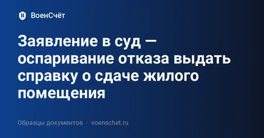 Заявление в суд подают, когда орган или должностное лицо отказали в выдаче справки о сдаче служебного/ведомственного жилого помещения или не выдали её в срок. Эта справка подтверждает факт сдачи квартиры (комнаты) по акту и часто нужна для постановки на учёт, закрытия жилищного дела, оформления компенсации или иных процедур. На этой странице вы найдёте бесплатный образец DOCX и пошаговую инструкцию: что указать в фактах, как обосновать требования, какие приложения добавить и как подать пакет, чтобы заявление приняли без возвратов. Грамотно составленное заявление в суд помогает признать отказ (или бездействие) незаконным и обязать выдать справку с нужной датой.