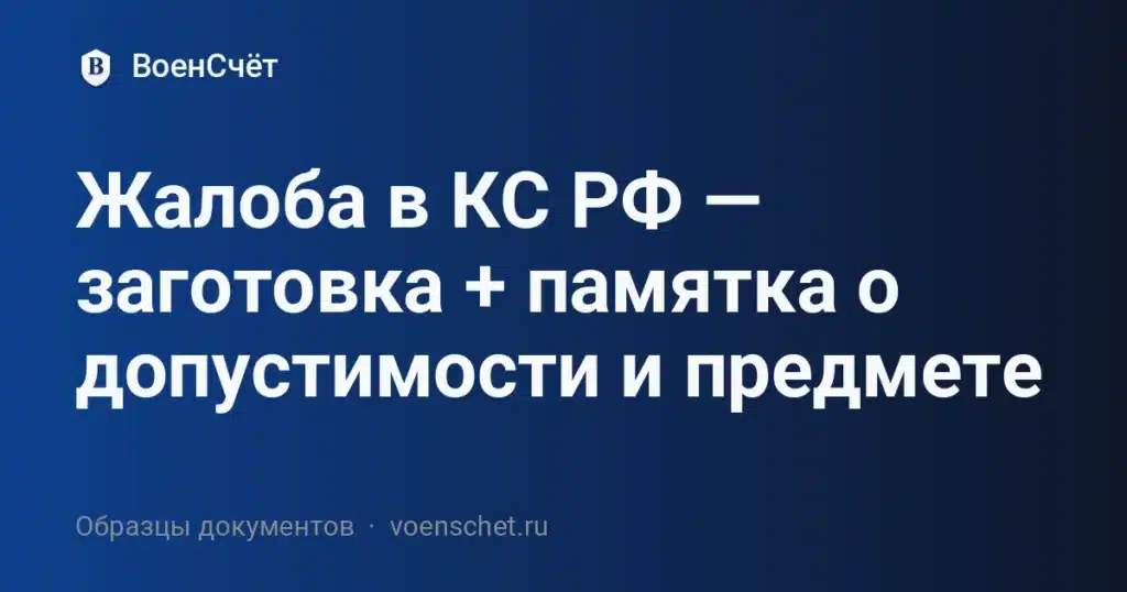 Готовый файл содержит: заготовку жалобы в КС РФ (шапка, предмет, применение, нарушенные права, правовая позиция, просительная часть, ходатайства) и памятку по допустимости/предмету с чек-листами.